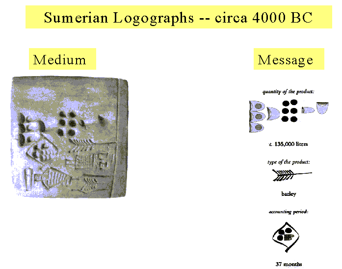 Last year, at the 1999 EBook conference, Dick Brass of Microsoft outlined the history of reading; this history was essentially that of the improvements in the hardware material that humans write on and read from. But there is another, parallel, history of reading, and this other history of reading is the story of how humans have found methods to represent their spoken words with written symbols. In fact, the first writings -- these Sumerian logographs from 4000 BC -- did not symbolize speech at all, but were simply pictures of objects and activities.