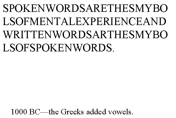 About 1000 years later, in 1000 BC, the first major upgrade in the technology of representing spoken language occurred -- namely, the addition of vowels to the alphabet by the Greeks. This is still essentially the same alphabet we use today -- and is considered one of humanity’s greatest inventions.