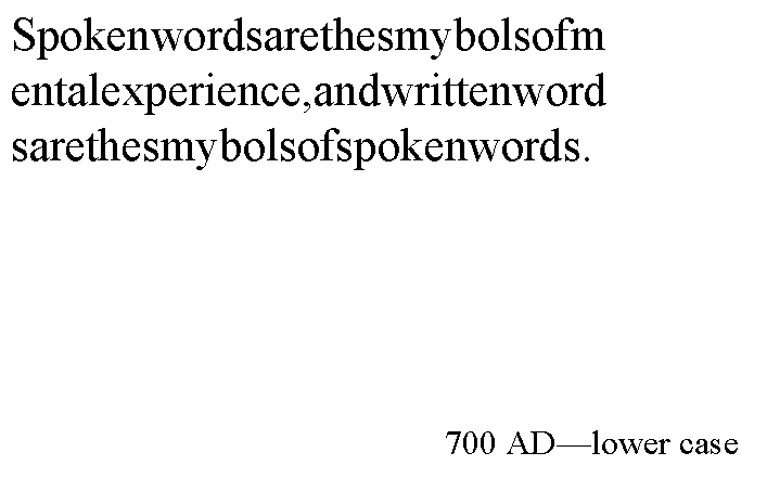 Yet another 1000 years passed before the next improvement in text occurred, namely the invention of lower case characters by Medieval Scribes. This invention increased the speed of transcribing manuscripts and also improved their legibility.