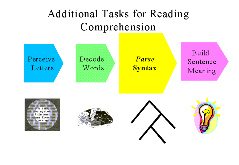 The next cognitive process in reading entails parsing-out the syntactic structure of the sentence; that is, interpreting how words relate to one another to form groups of words or phrases, and how these groups of words relate to other groups of words.