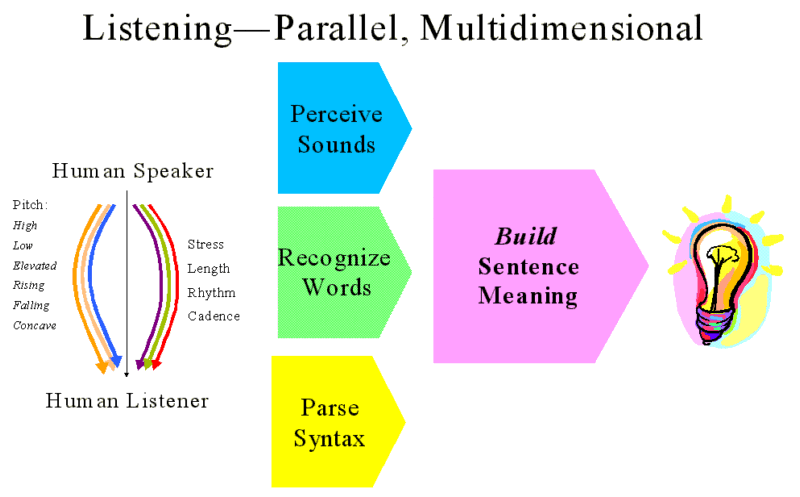 By contrast, in listening, because each word and phrase is accompanied by syntactic cues, which are used instantly in the overall task of comprehending the sentence, the process is parallel and multidimensional.