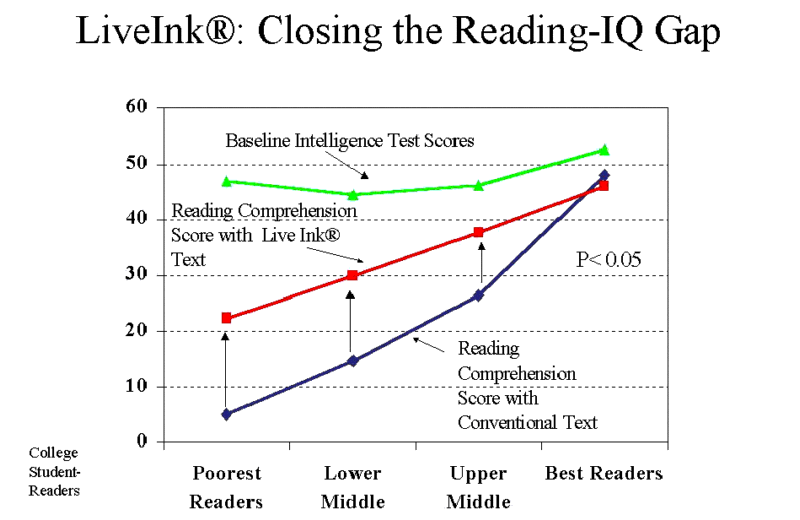 Finally, this independent research found that, in the vast majority of otherwise normal, college-level readers -- all but the uppermost 25 percentile -- LiveInk doubled reading comprehension. This lower 75 percentile was as intelligent as the upper 25 percentile; LiveInk was able to eliminate about half of the Reading-IQ gap for these readers. In other words, LiveInk helped level the playing field of reading for a large majority of the population.